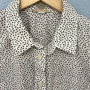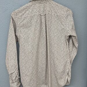 Long-sleeved woman’s shirt by Duluth Trading Company in brown print on light tan background. Shirt-tailed hem. Casual style pairs well with jeans, cargo pants or shorts. Size is small. Fabric is 98% cotton, 2% spandex. Wrinkle resistant. Machine washable.