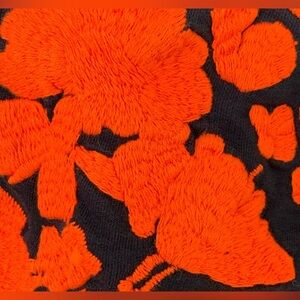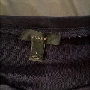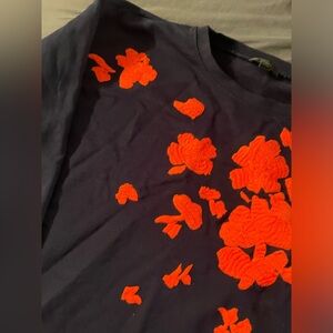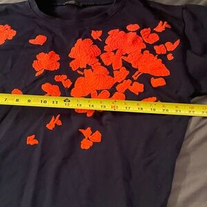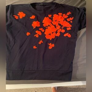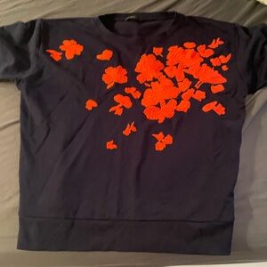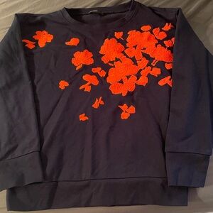 Size large crew neck sweatshirt from J. crew with vibrant coral pinkish floral embroidery in navy blue. In used but good condition as it wasn’t worn much. Measurements are in the photos. From a non smoking no pet household. Great quality!