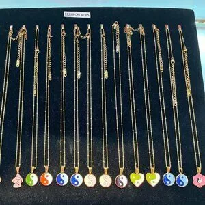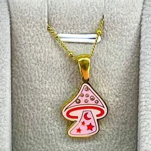 Adorable Yin and Yang and Mushroom necklaces, perfect for any occasion! Crafted from gold plated stainless steel, these 18-inch long necklaces are designed to last. Each necklace offers unique designs and colors, adding a playful touch to your accessory collection.