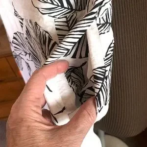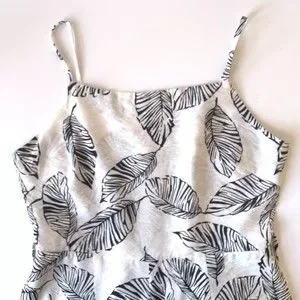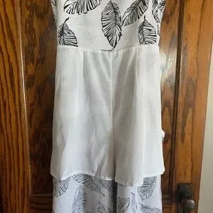 Loose and cool summer jump suit in black and creamy white tropical leaf print. Brand/size tag is missing. Check measurements carefully. Estimating it as medium or large based on my mannequin. Features include on-seam side pockets, back zipper, adjustable spaghetti straps, and fitted bodice with darts. There are belt loops if you want to add a belt. Bodice is lined with self fabric, pant section is partially lined with a silky smooth white fabric. Fabric content is a cotton/rayon/spandex blend. Looks and feels very much like linen. Has a crinkly texture. Needs no ironing. Line dries quickly. No underarm stains. No holes or other stains. Ships next business day from smoke free, pet free home.