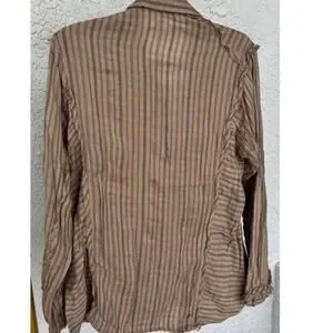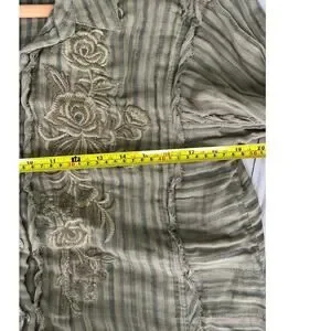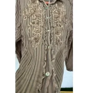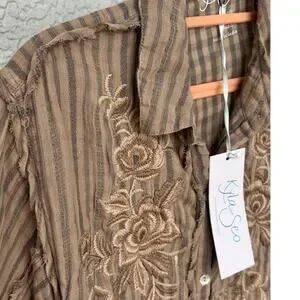 New with tags Anthropologie Kyla Seo Myra shirt. This shirt features ram hems and is made of double soft 100% cotton. It includes handmade embroidered flower embroidery and is in graphite stripe color by manufacturer. Buttons up, absolutely adorable country Bohemian chic style shirt for all seasons. In great condition with tags.