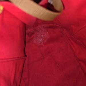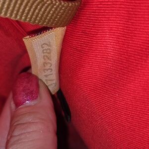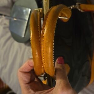 Dooney and Bourke vintage dome satchel patient and tan leather with red interior. There are 2 call outs: a stain on the inside (easy clean), slight discoloration on leather. See all the photos. The dome bag has a full double zipper top. Comes with original crossbody. The inside has a zipper pocket, pocket, and 2 slip pockets. Bottom has 4 feet.