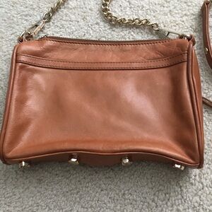 Rebecca Minkoff small crossbody in tan color. Used and with some marks and scratches but IMO still looks fine. Soft leather. Blue inside. Chain and leather strap. If need more pics or have questions please comment below.