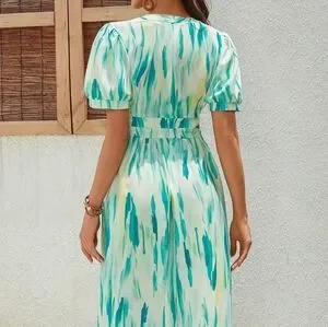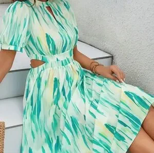 Gorgeous, summer dress in size Large. This dress has an all-over print in different shades of green, blue, yellow and cream. It has cut outs on both sides and puff sleeves. It zips up in the back (zipper is about 21 inches long, white in color). Perfect for a wedding or date!🥰 Worn once to a wedding.