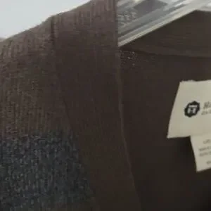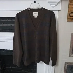 great used condition. Haggar Clothing Co. LG. 💯 Acrylic. V-Neck. brown and charcoal. large buttons. chest 23.5 inches. 27 inches. sleeve 25 inches. soft and comfortable. B6