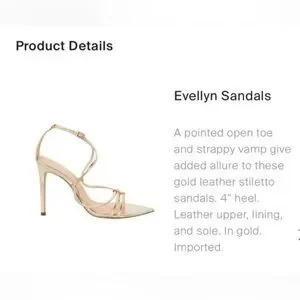 Gold leather stiletto heels. 4 inches. My daughter wore about 1 or 2 times. The heels come with dust bag.