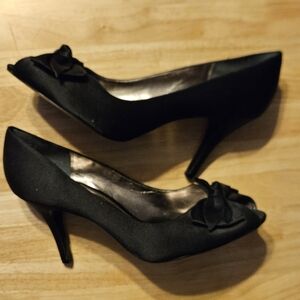 The Touch of Nina, Black satin peep toe pumps with decorative fashion bow, size 11 M. Composition leather sole with 2-1/2" heel. Pre-owned, Excellent condition.