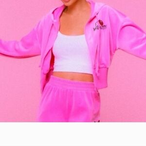 From the Hello Kitty and Friends x Forever 21 collection, this pair of velour tracksuit features a drawstring waistband, on-seam pockets, a straight leg, and "Hello Kitty" text and character graphic.