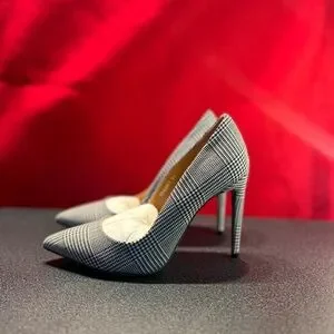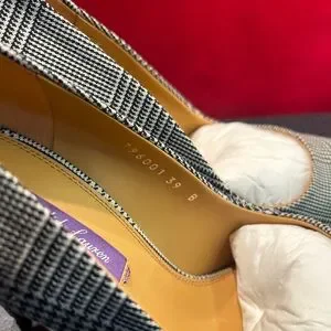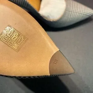 Uppers: Wool Lining/Footbed: calfskin & goatskin leather Outsole: Leather with rubber at the tip of the toe. Color: Glen Plaid Black. Pointed toe. 100mm heel height.