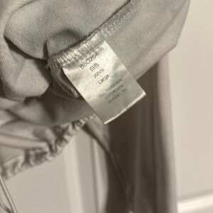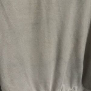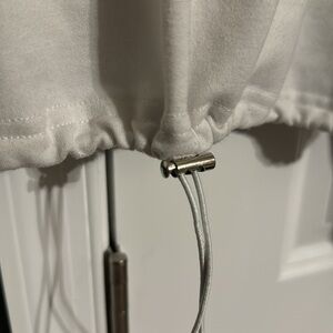 White, long sleeve, wider neck. Hardware cinch elastic quiz. Light blue tie-dye feature lightly seen in photos.