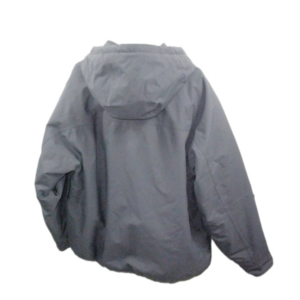 This jacket is in excellent condition, no notable flaws. It has a mock length collar with an attached hood. The front has zip/velcro/snap closure. This is heavyweight and warm. The front has two velcro flap pockets on the chest and two large side zip pockets on the lower section. The interior has two large pockets with velcro closure. The cuffs have velcro adjustable straps. The bottom of the jacket has interior secured drawstring so it can be tightened.