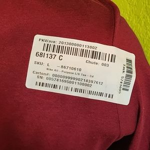 New without tags. Nike All-Purpose long sleeve tee in a rich maroon color. Standard fit with crew neck and subtle Nike Swoosh logo on the back neck. Size large. Made of 100% cotton for soft, breathable comfort. Great for layering, workouts, or everyday wear.