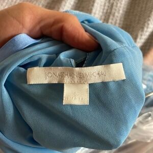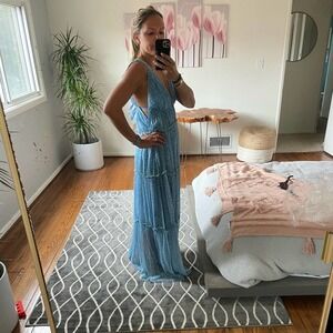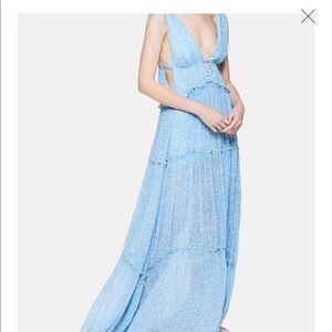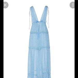 The label's Mellie sleeveless maxi falls in tiers of powder blue floral silk chiffon from a plunging neckline from a daytime take on the chemise. Ruched tie shoulders. Back tie closure. Partially lined. Pull-over style