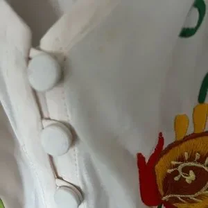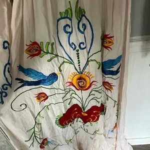 The most flattering dress on! Size small. As pictured there is a tiny stain smaller than a pea that is a very light tan. Isn’t noticeable, but being transparent.
