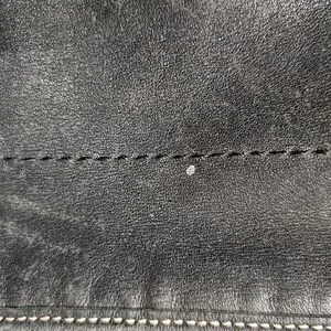 Nice handbag. Measures 13.5 in. X 3 in. X 11 in. with a handle drop of 8 inches. Fringe zip closure. Small light speck on one side. No pets or smoking.