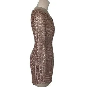 This is a long sleeve rose gold sequined mesh mini dress with a plunge neckline by Shareen Collections Australia. This glam dress is perfect for a bachelorette party, clubbing, Vegas or any other special night out.