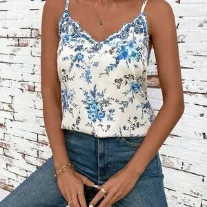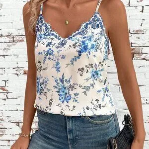 Blue Boho Women's Ditsy Floral Sleeveless Camisole Top With Embroidered Neckline