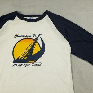 Vintage 70s 80s Raglan T Shirt Size Large Baseball 3/4 Sleeve Chincoteague Virginia Sail Boat Boating Beach Graphic Tee Retro Vacation