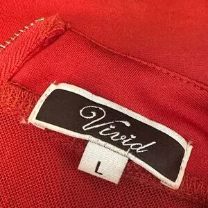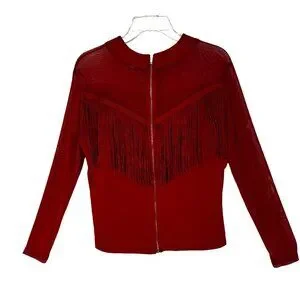 Vivid Women's Red Fringe Western Long Sleeve Top Size L Sheer Bodice and Sleeves