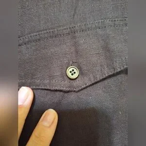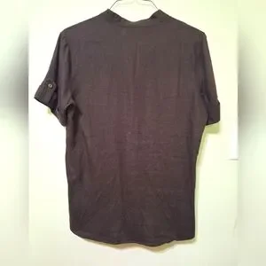 Description: Button up metal buttons. 2 front button pockets. v neck. rolled cuff with button to keep rolled. slightly longer in back. small side slit.