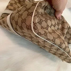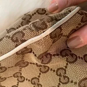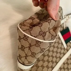 Beautiful authentic Gucci wiith magnetic snap closure . Interior of bag is spotless. Good condition no exposed piping . Photos is making the leather strap look bright and new . It’s. Not.. The white leather strap and trim is very dull from years of use. True color of leather is in last photo ! There are snaps on the sides that allow you to expand the width if you choose too! If you are familiar with Gucci canvas ..it will tear over time . so please keep that in mind. I just want to be very honest . thanks for looking!!this bag is a beauty !