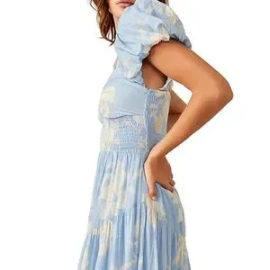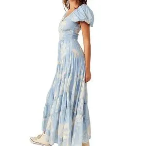 Free People Floral Print Sweetheart Neck Short Puff Sleeve Blue Maxi Dress Sz M