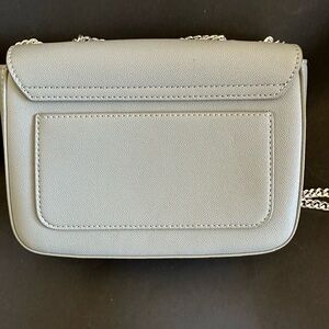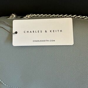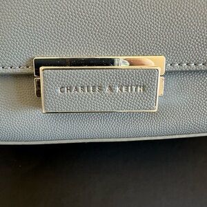 This is a Charles and Keith mini bag in dusty or powder blue faux leather. Used only twice but has some scratches in the front hardware closure. The handle is silver chain and can be hand held, crossbody or shoulder bag. There is a pocket at the back of the bag. Inside is a zip pocket and slip pocket. The approximate measurement is 6” H x 8” W.