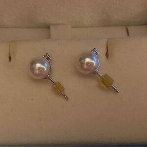 Mikimoto pearls with diamonds in the blue velvet box. Please see card for more details. 18k white gold posts. 6 x 6.5mm