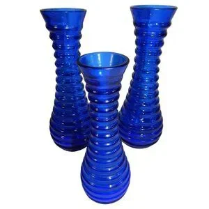 These cobalt blue ribbed glass vases offer a classic touch to any decor. Their rich blue hue and ribbed texture evoke a timeless elegance.