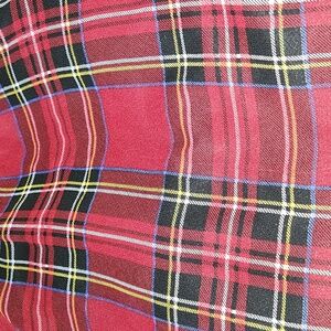 Simply Be red tartan plaid dress. Short cap sleeves. Scoop neck with covered front button placket. Elastic waist. Pockets at hips. Fully lined.