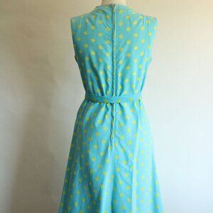 Darling vintage 1960s dress in robins egg blue with yellow polka dots. Has a matching belt! Sleeveless, metal zipper up the back. I'd say in the smaller to medium size range but do see measurements below. No label. Looks and feels like cotton to me