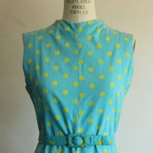 Vintage 1960s Dress with Belt, Blue with Yellow Polka Dots, Summer