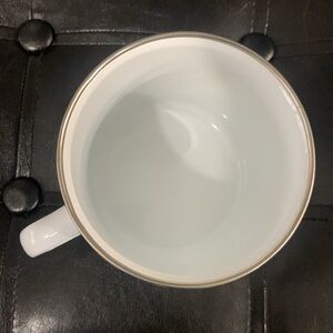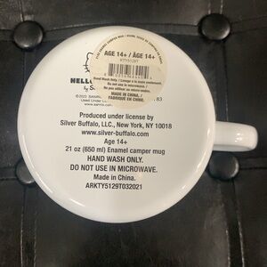 This adorable coffee mug is part the Hello Kitty collection by Sanrio & Silver Buffalo. It is a white metal mug with sweet Hello Kitty's face in a pink bow. Mug has black speckles patterned throughout and "Hello" in script on one side. Piece is about 4 inches in total height and 4 inches in diameter (not including handle). The tag is NOT attached. This mug is pre-owned but has never been used. Piece is free of chips & cracks. It comes from a non smoking home. Item is sold AS IS. If you have any questions about the listed item or its packaging or shipping please message me before buying.