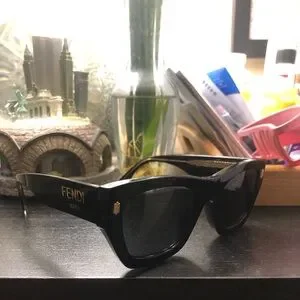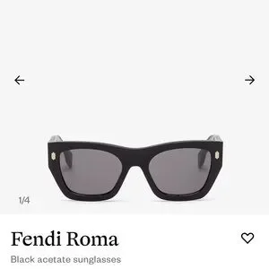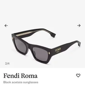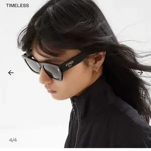 Rectangular Fendi Roma sunglasses in black acetate. Temples with visible metal core with laser etched FF. Gold finish Fendi Roma logo on the sides. Gray lenses.
