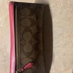 Used. Good condition. Hot pink and tan large Coach tote and matching wallet set. Hot pink interior.