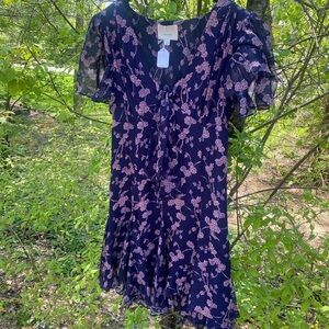 Cinq A SEPT Navy Silk Floral Mini Dress Swingy Handkerchief Flare Hem