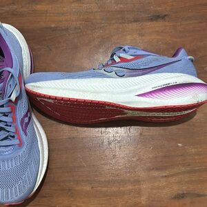 Saucony Triumph women’s size 8. They show no signs of wear. Lots of miles left in these shoes!