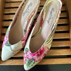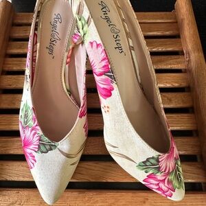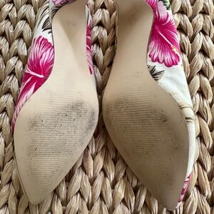 Beautiful slip-on shoes in floral pattern print. 🌸🌸 Very summery 🌸🌸 All man-made material in size 7M. 2.5 heels. Good condition but with minor imperfections on the left tip of the shoe. Pls zoom in on photos.