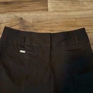 Brown women’s dress pants from Express. This is their Editor line. Two faux pockets in the front and two usable, but shallow, pockets in the back. Zipper fly with button and triple clasp. Size is an 8R.