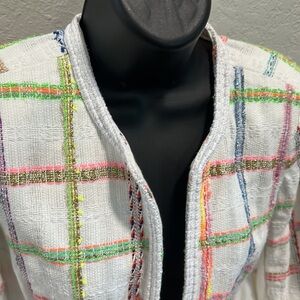 Cool your summer with cotton. Keep it luxuriant in a couture tweed from France. Brilliant multi-hued, multi-textured jacket with solid stretch linen blend twill panels is a refreshing moonstone white with pops of trending brights. Fancy braid trims the neck, placket, hem, pockets and cuffs.