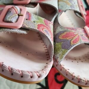 Women's new la Plume Italian leather sandals. Size 8.5 (40) in pastel colors. Never worn, in box. 1 1/2 inch heel. Cute pink stitched pink soles!