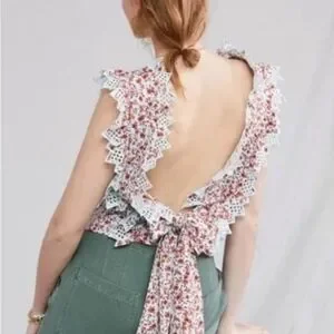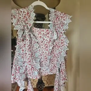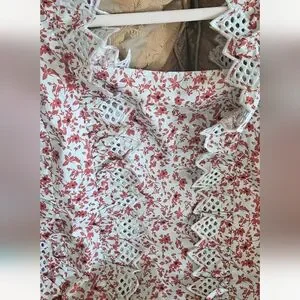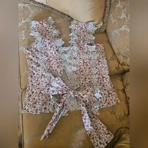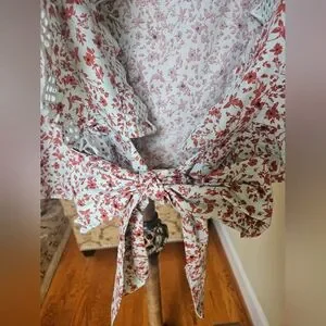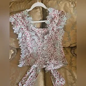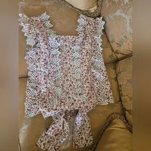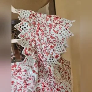 NWOT Anthropologie Blue Tassel Trina floral dark red/ mint embroidered top