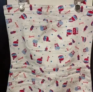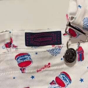 Barely Worn - from the 2019 discontinued Harajuku brand Aymmy in the Batty Girls. Overalls from Aymmy Seto's 2014 Junk collection with custom limited allover print, 5 pockets, adjustable straps, zipper mid back and rubber logo stamp on left back pocket. White Cotton Denim, US S/US 8