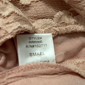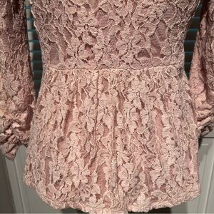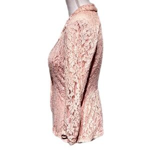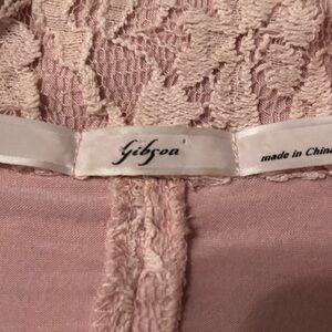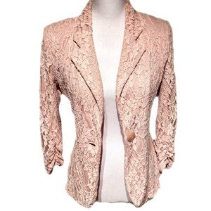 So cute! The label looks like it says Gibsoa but I’m not sure. Pink Lace One button blazer fully lined gathered sleeves and back of waist for a flattering fit. Size small. Shoulder pads which can be removed.
