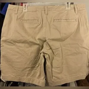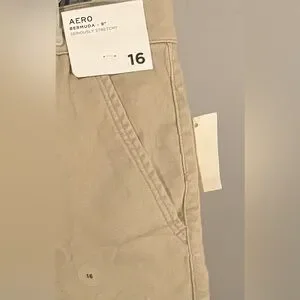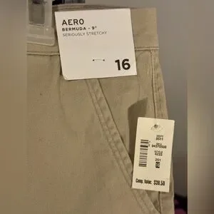 Brand new authentic Aeropostale Bermuda khaki shorts; slightly above knee length; 9” Bermuda length; medium-dark khaki color; brand new with tags still attached; never worn; was an impulse buy and doesn’t fit because of weightloss; made of 97% Cotton/3% Spandex fabric; great stretchy, thick and durable fabric of great quality.
