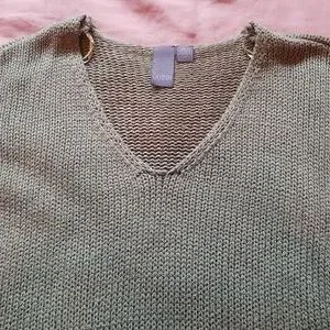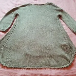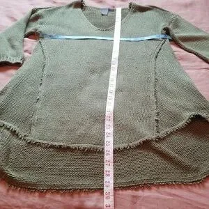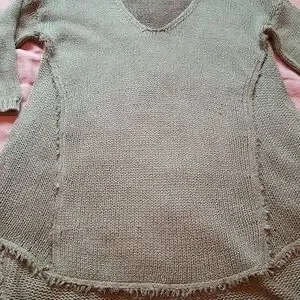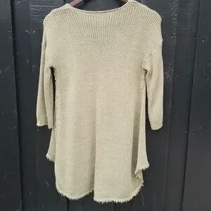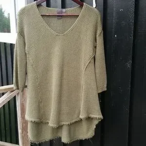 Very roomy, slightly distressed pullover sweater by Quinn. Size small. V neck, raw edges and hem, high/ low hemline, 3/4 sleeves. Very boho. Fabulous with your favourite jeans for a relaxed, comfy and sexy weekend vibe.