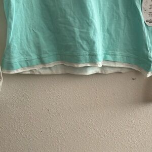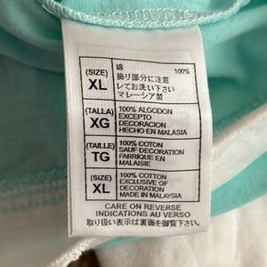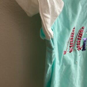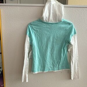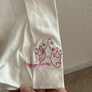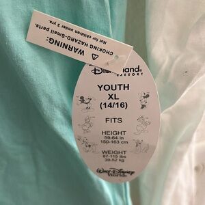 Disney girls long sleeve hoodie shirt. New with tags. Size XL (14/16). Colors are t-shirt part light blue, sleeves and hood white. Left sleeve at bottom has castle and says Walt Disney world in pink. Word Mickey on front in middle in sequence, ribbon, rhinestones, etc. Tagless at neckline. No visible stains, markings, rips, tears, or holes. 100% cotton. Machine was inside out, warm, gentle cycle with similar colors, no bleach, tumble dry low, do not iron decorations, do not dry clean. Sold as is. Pleas see pictures. From non smoking, kid friendly home. Offers accepted. Ships USPS.