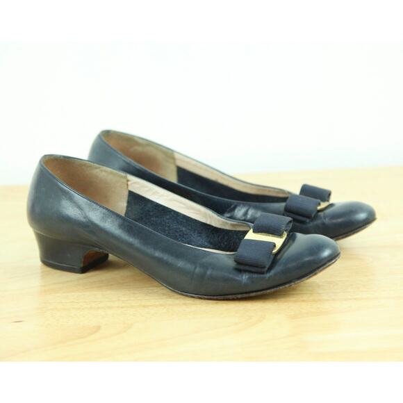 Vintage Salvatore Ferragamo navy blue leather Vara heels size 7 1/2 AA.
