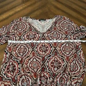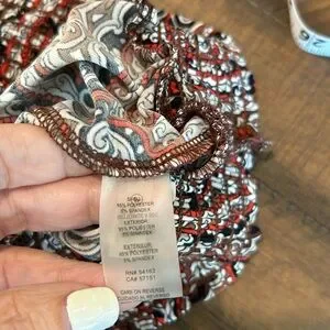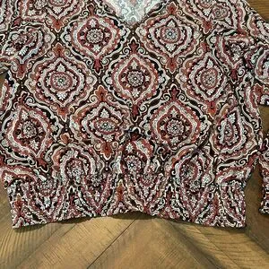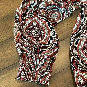 Love the pattern and colors in this long sleeve blouse. Very lightweight with elastic cuffs and hem, very neck collar. Like new condition. Great for any season. So many colors to pull from and coordinate with. Let me know if you have any questions.