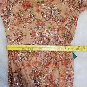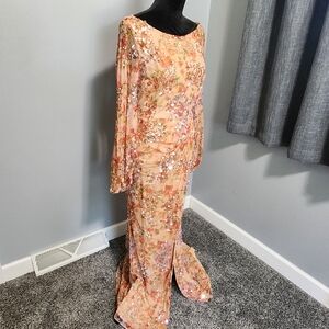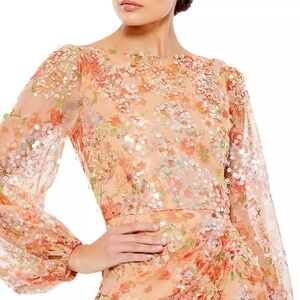 NWT Mac Duggal Floral Print Sequined Puff Sleeve Gown Size 6 Apricot